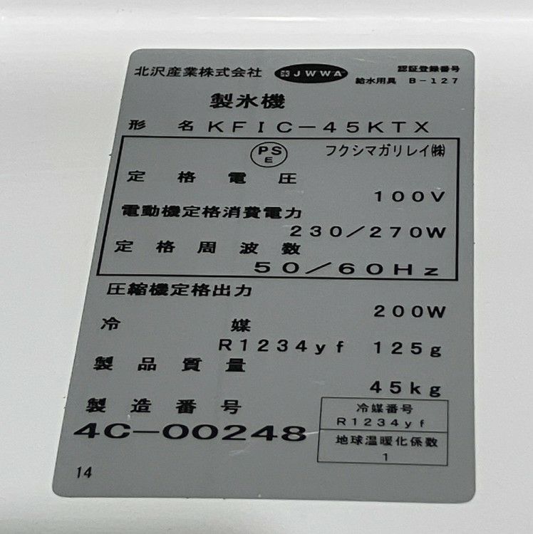 他の画像を見る 2024年製 北沢産業 45kg製氷機 KFIC-45KTX 東京町田店 中古品 単相100V 販売価格 ¥ 236,500 税込 SOLD OUT W630xD450xH800商品ランク:B 詳細を見る お気に入りに登録する