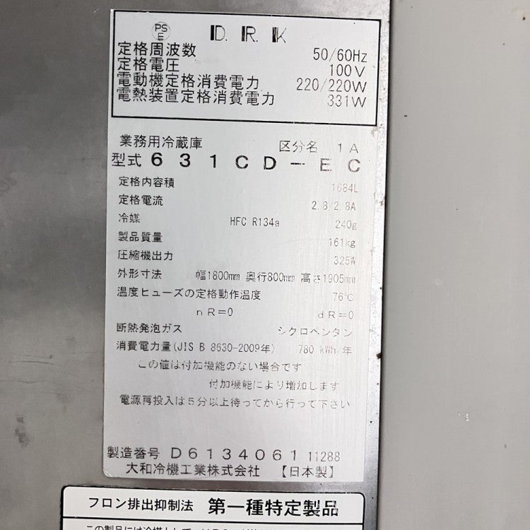 他の画像を見る 2018年製 大和冷機 縦型冷蔵庫 631CD-EC 東京町田店 中古品 単相100V 販売価格 ¥ 126,500 税込 SOLD OUT W1800xD800xH1905商品ランク:B 詳細を見る お気に入りに登録する
