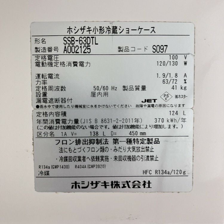 他の画像を見る 2021年製 ホシザキ 冷蔵ショーケース SSB-63DTL 東京町田店 中古品 単相100V 販売価格 ¥ 63,800 税込 SOLD OUT W630xD450xH1080商品ランク:B 詳細を見る お気に入りに登録する