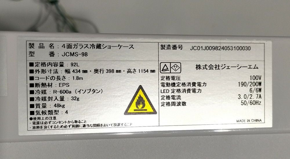 他の画像を見る 2022年製 JCM 4面ガラス冷蔵ショーケース JCMS-98 東京町田店 中古品 単相100V 販売価格 ¥ 30,800 税込 SOLD OUT W434xD398xH1154商品ランク:A 詳細を見る お気に入りに登録する