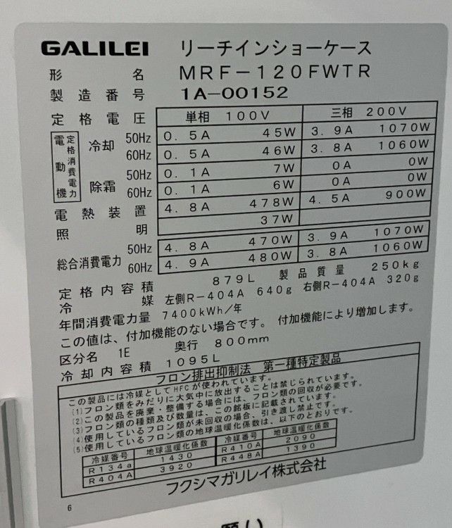 他の画像を見る 2021年製 フクシマガリレイ リーチイン冷凍ショーケース MRF-120FWTR 東京町田店 中古品 三相200V 販売価格 ¥ 236,500 税込 W1200xD800xH1900商品ランク:B カートに入れる お気に入りに登録する
