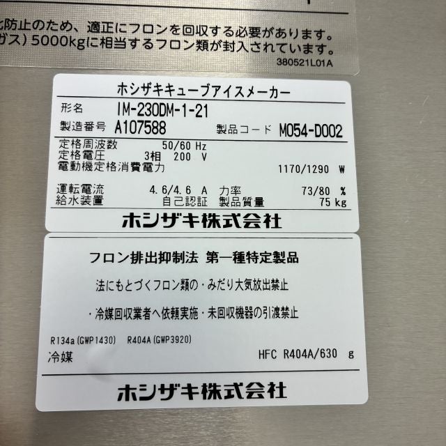 他の画像を見る 2021年製 ホシザキ 230kg製氷機ハーフアイスメーカー IM-230DM-1-21-STN 大阪店 中古品 三相200V 定価 ¥ 1,751,200 のところ 販売価格 ¥ 231,000 税込 W1080xD710xH1425商品ランク:B カートに入れる お気に入りに登録する
