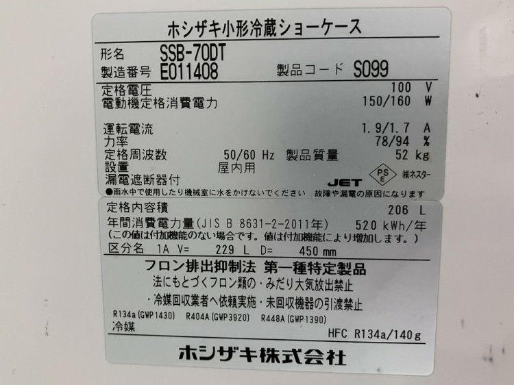 他の画像を見る 2025年製 ホシザキ 冷蔵ショーケース SSB-70DT 東京町田店 中古品 単相100V 販売価格 ¥ 88,000 税込 SOLD OUT W700xD450xH1410商品ランク:B 詳細を見る お気に入りに登録する