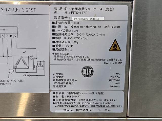 他の画像を見る 2021年製 JCM 対面冷蔵ショーケース RITS-147T 愛知店 中古品 単相100V 販売価格 ¥ 110,000 税込 W900xD680xH1215商品ランク:A カートに入れる お気に入りに登録する