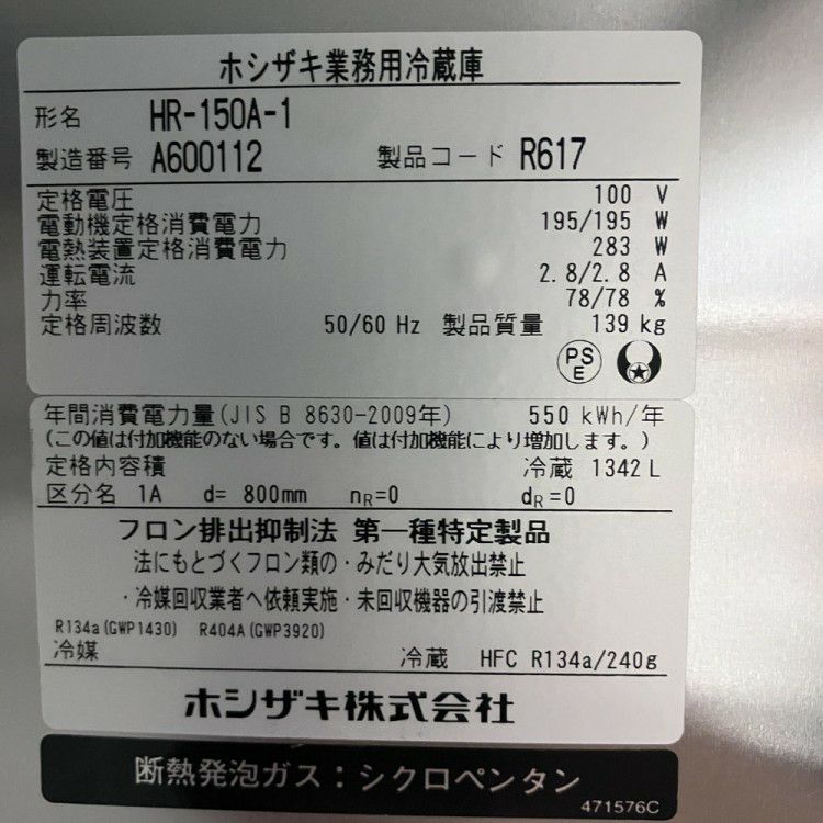 他の画像を見る 2021年製 ホシザキ 縦型冷蔵庫 HR-150A-1 東京町田店 中古品 単相100V 販売価格 ¥ 170,500 税込 SOLD OUT W1500xD800xH1910商品ランク:B 詳細を見る お気に入りに登録する
