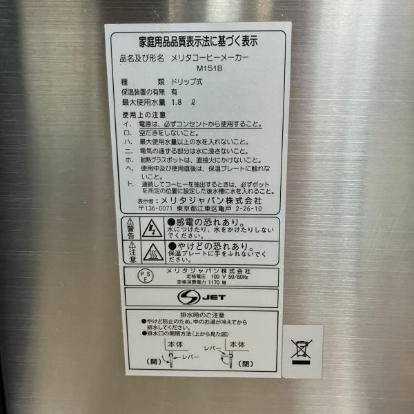 他の画像を見る 年式不明 メリタジャパン コーヒーメーカー M151B 大阪店 中古品 単相100V 販売価格 ¥ 22,000 税込 SOLD OUT W230xD355xH495商品ランク:B 詳細を見る お気に入りに登録する