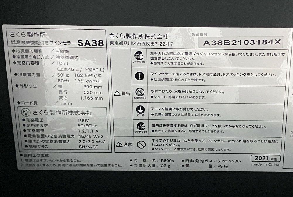 他の画像を見る 2021年製 さくら製作所 ワインセラー SA38 東京町田店 中古品 単相100V 販売価格 ¥ 59,950 税込 SOLD OUT W390xD530xH1175商品ランク:B 詳細を見る お気に入りに登録する