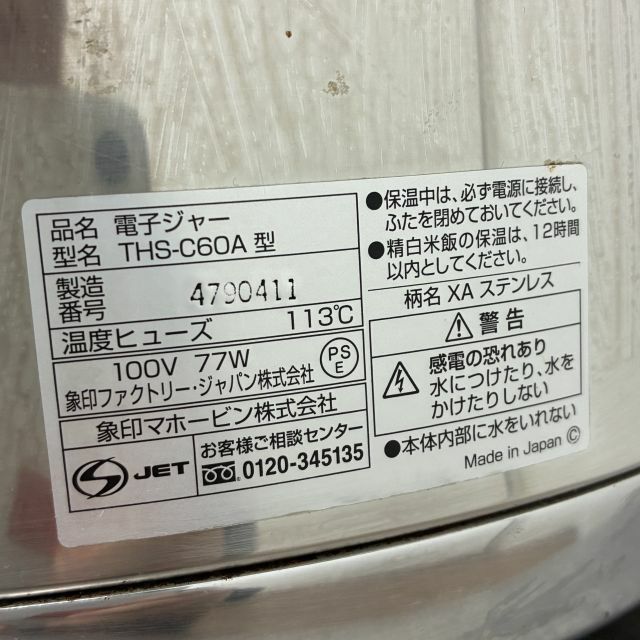 他の画像を見る 2019年製 象印 電子保温ジャー THS-C60A 大阪店 中古品 単相100V 定価 ¥ 36,300 のところ 販売価格 ¥ 15,400 税込 SOLD OUT W460xD380xH320商品ランク:B 詳細を見る お気に入りに登録する