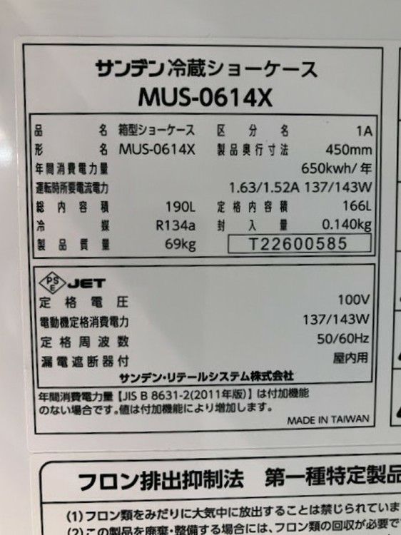 他の画像を見る 2022年製 サンデン 冷蔵ショーケース MUS-0614X 東京町田店 中古品 単相100V 販売価格 ¥ 84,700 税込 SOLD OUT W600xD450xH1400商品ランク:A 詳細を見る お気に入りに登録する
