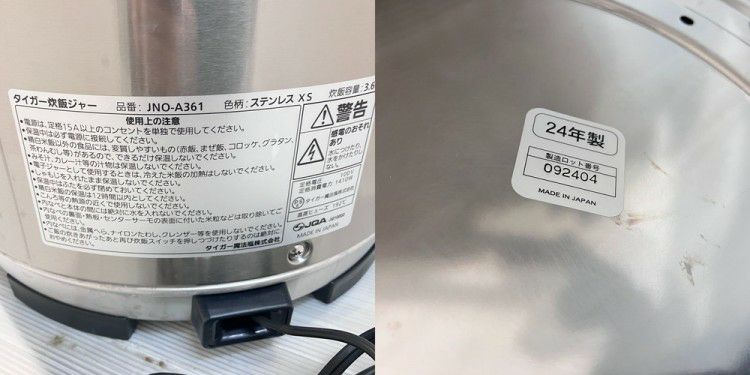 他の画像を見る 2024年製 タイガー 電気炊飯ジャー JNO-A361 東京町田店 中古品 単相100V 販売価格 ¥ 33,000 税込 SOLD OUT W360xD426xH383商品ランク:B 詳細を見る お気に入りに登録する