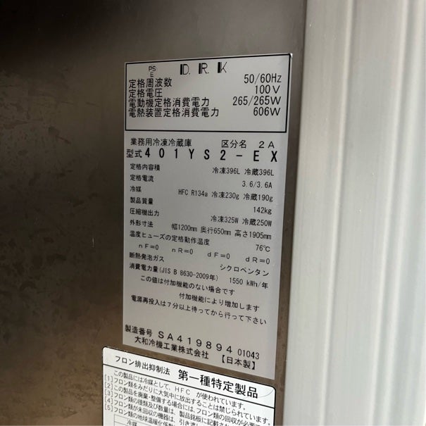 他の画像を見る 2023年製 大和冷機 縦型冷凍冷蔵庫 401YS2-EX 東京足立店 中古品 単相100V 販売価格 ¥ 198,000 税込 SOLD OUT W1200xD650xH1905商品ランク:A 詳細を見る お気に入りに登録する