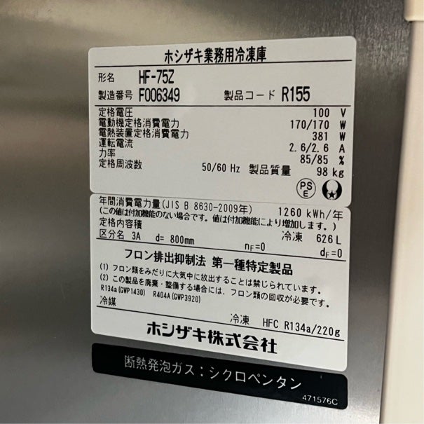 他の画像を見る 2013年製 ホシザキ 縦型冷凍庫 HF-75Z 東京足立店 中古品 単相100V 定価 ¥ 1,147,300 のところ 販売価格 ¥ 79,200 税込 SOLD OUT W750xD800xH1890商品ランク:B 詳細を見る お気に入りに登録する
