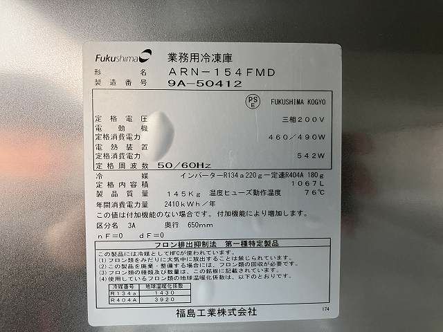 他の画像を見る 2019年製 フクシマガリレイ 縦型冷凍庫 ARN-154FMD 愛知店 中古品 三相200V 定価 ¥ 1,402,500 のところ 販売価格 ¥ 143,000 税込 SOLD OUT W1490xD650xH1950商品ランク:B 詳細を見る お気に入りに登録する