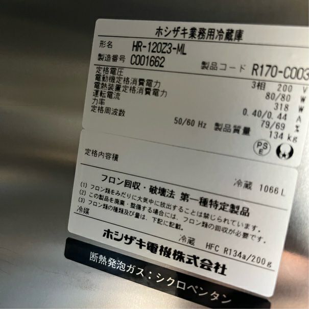 他の画像を見る 2022年製 ホシザキ 縦型冷蔵庫 HR-180A-1-ML 大阪店 中古品 単相100V 定価 ¥ 1,745,700 のところ 販売価格 ¥ 177,100 税込 SOLD OUT W1800xD800xH1910商品ランク:B 詳細を見る お気に入りに登録する