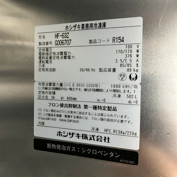 他の画像を見る 2017年製 ホシザキ 縦型冷凍庫 HF-63Z 大阪店 中古品 単相100V 定価 ¥ 1,036,200 のところ 販売価格 ¥ 110,000 税込 SOLD OUT W625xD800xH1890商品ランク:B 詳細を見る お気に入りに登録する
