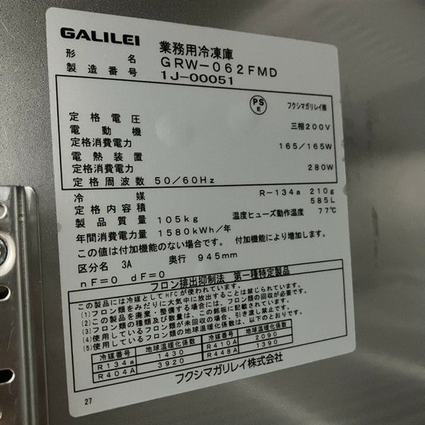 他の画像を見る 2021年製 フクシマガリレイ 縦型冷凍庫 GRW-062FMD※奥行945mm 大阪店 中古品 三相200V 販売価格 ¥ 134,200 税込 W610xD945xH1950商品ランク:B カートに入れる お気に入りに登録する